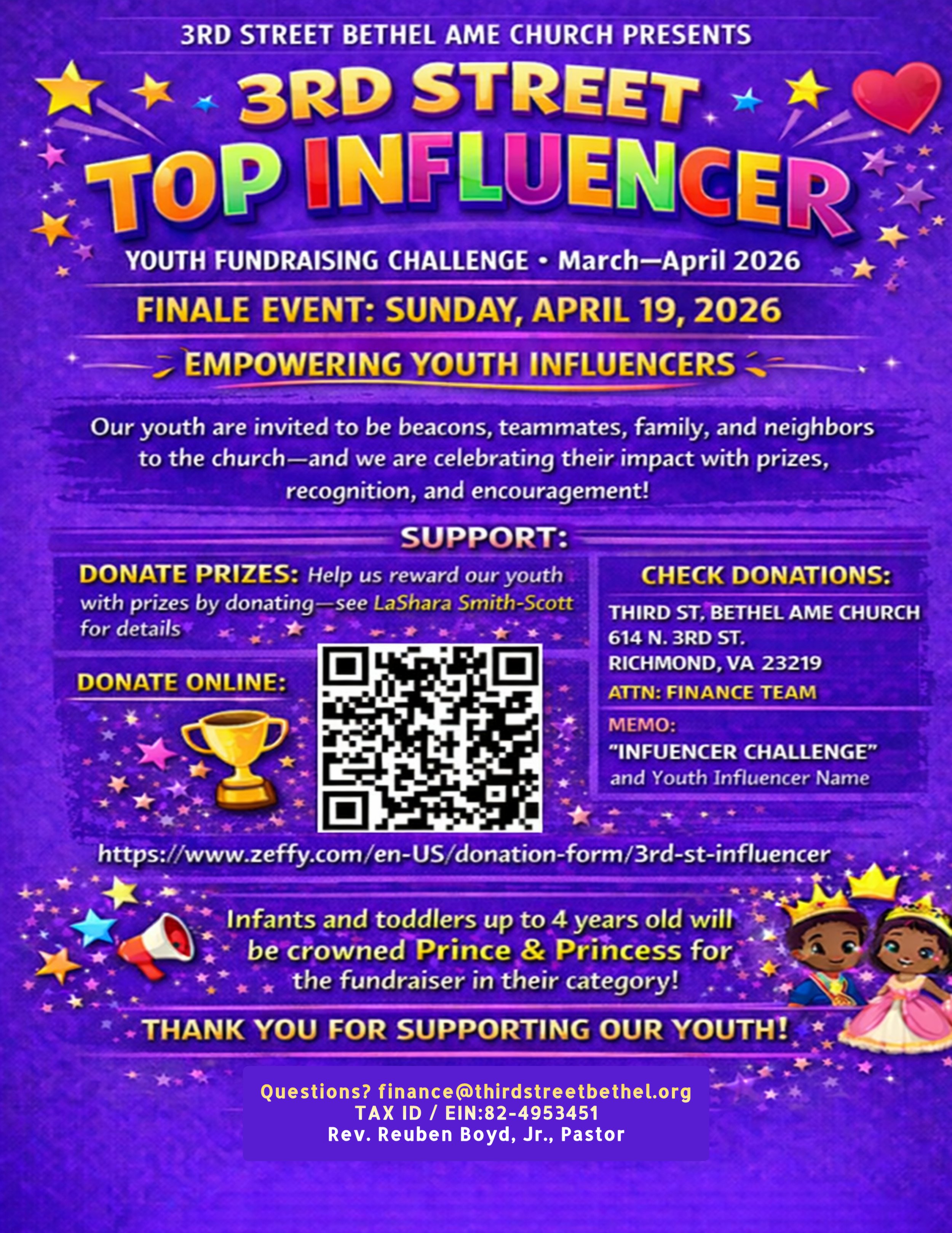 Cash or Check Payable to: 3rd St. Bethel AME (Memo: Youth’s Name OR Influencer Prize Donation)